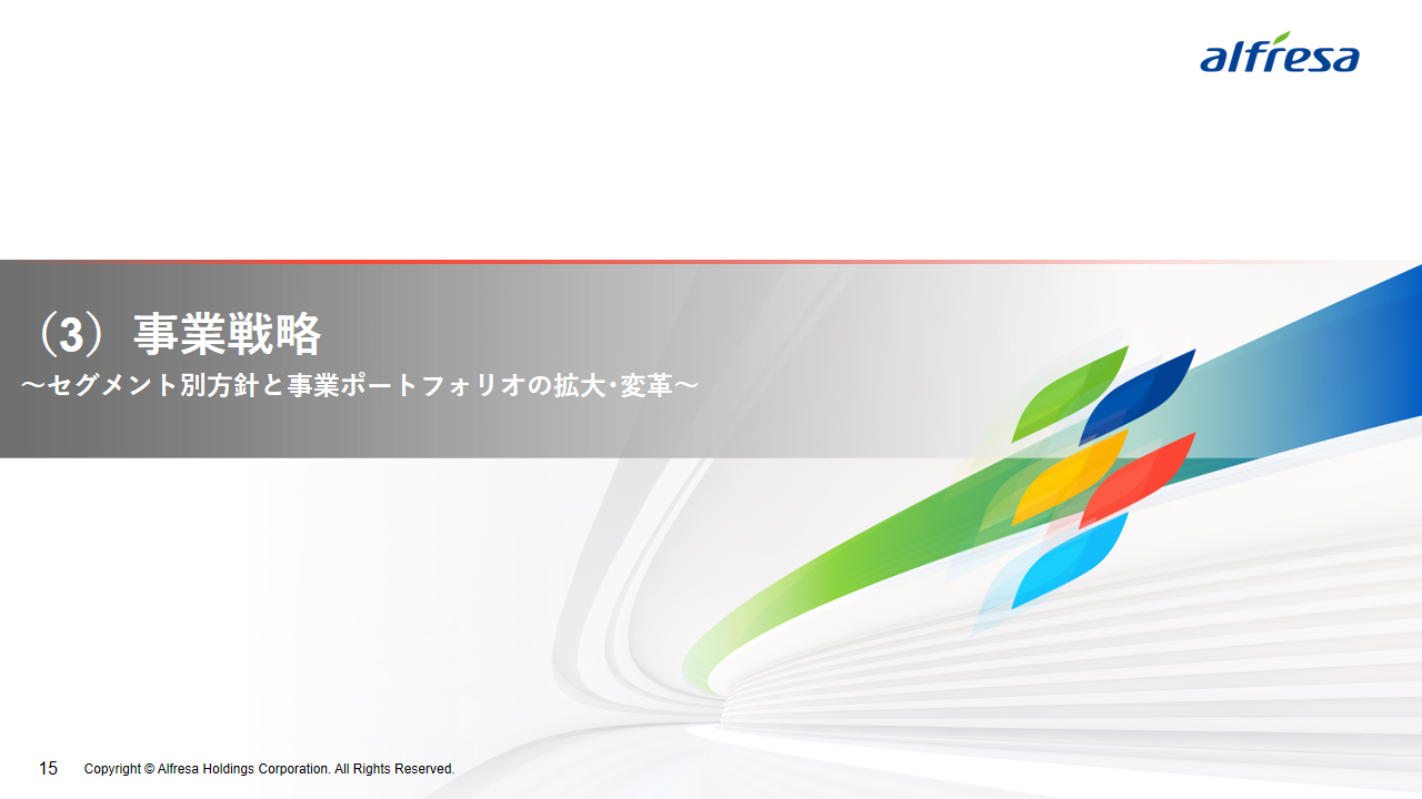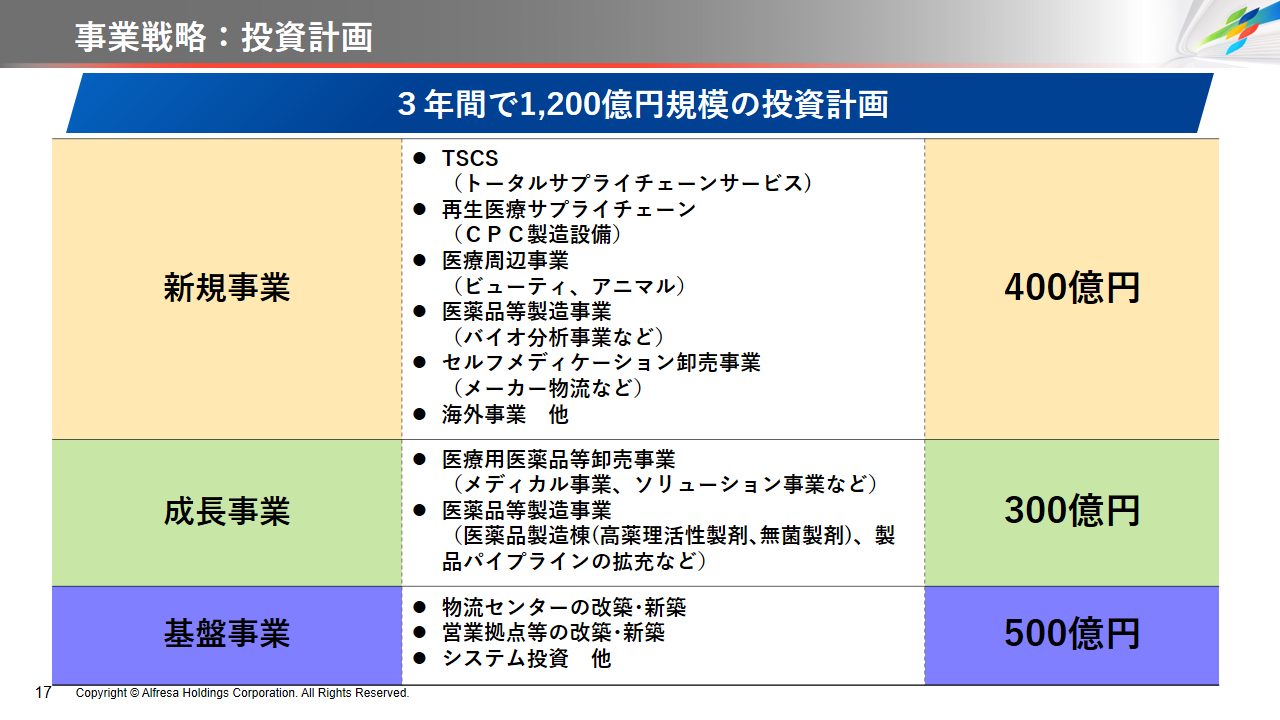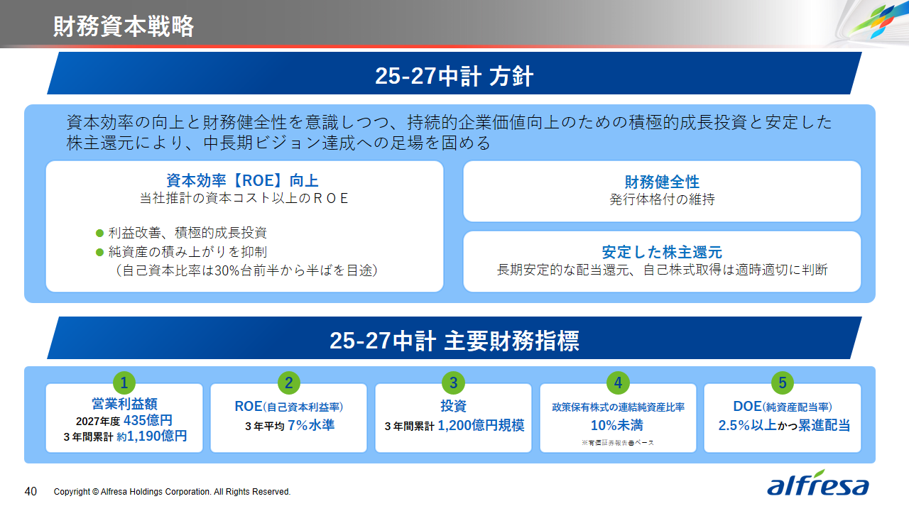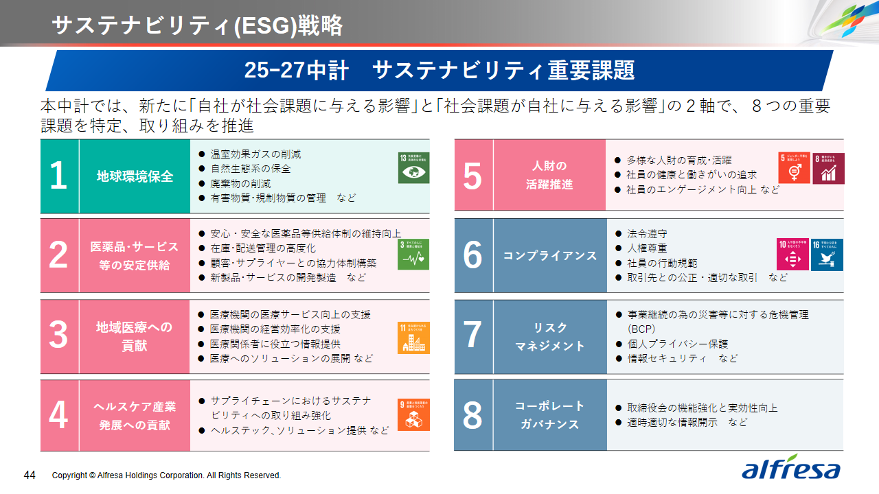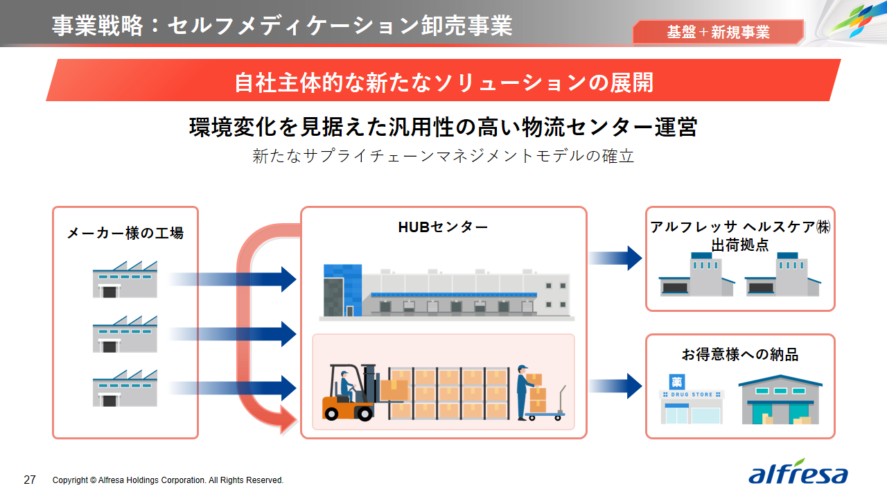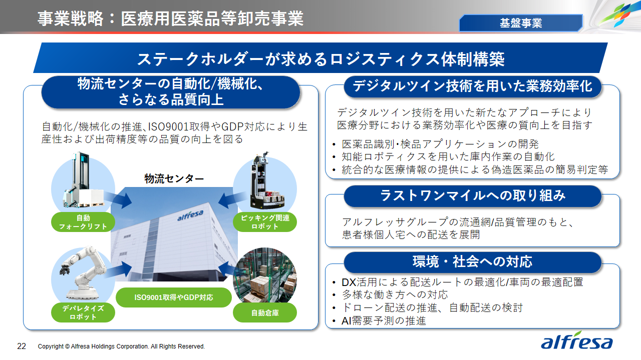 当社グループは、2023年に策定した2032年度までの中長期的な事業戦略および財務・資本戦略「アルフレッサグループ中長期ビジョン」において、グループ理念に基づき、健康寿命の延伸、地域医療への貢献、およびヘルスケア・イノベーションなどの社会価値を創造するため、基盤事業強化、成長事業育成、新規事業開発の事業戦略を遂行し、トータルサプライチェーンサービスの強化と拡大を目指しています。今回策定した「25‐27中計」は、「中長期ビジョン」の目標達成に向けた第2ステージであり、確実な利益拡大のための重点投資とコスト最適化により、これまでの取り組みを進化させてまいります。