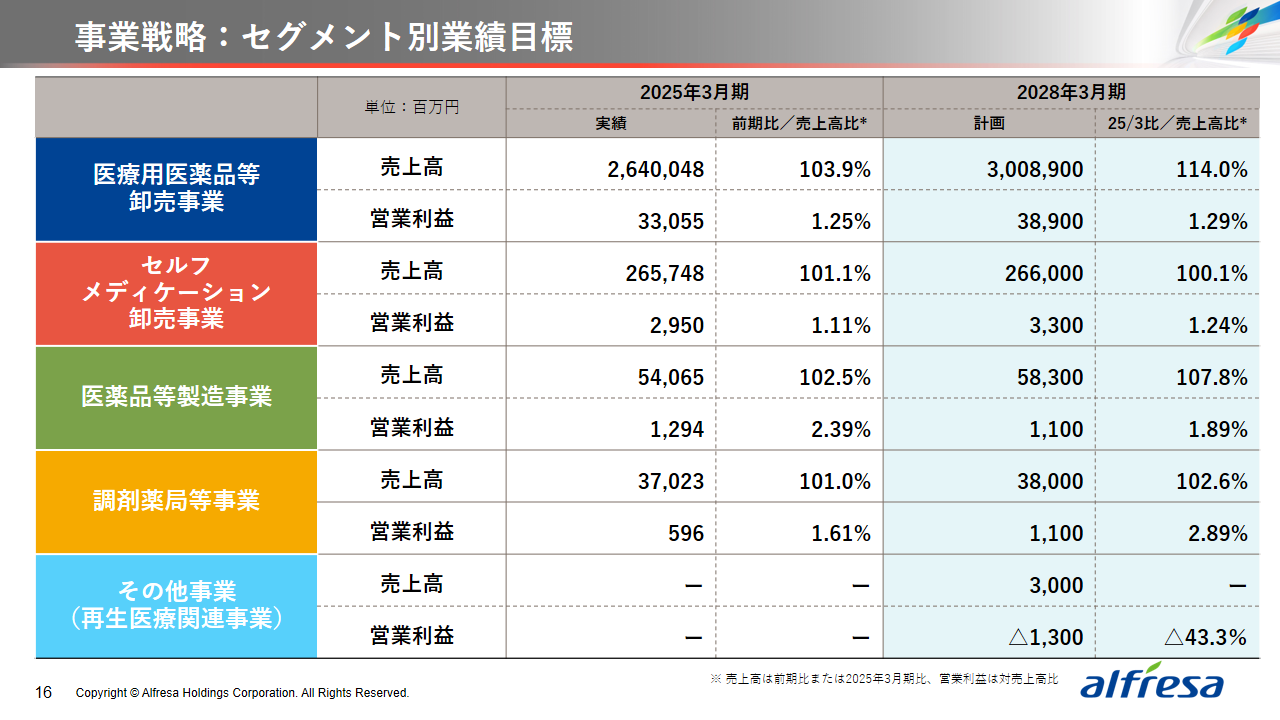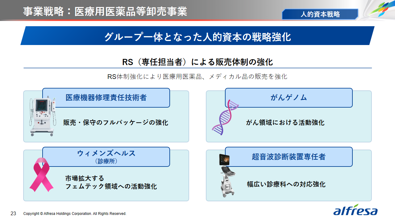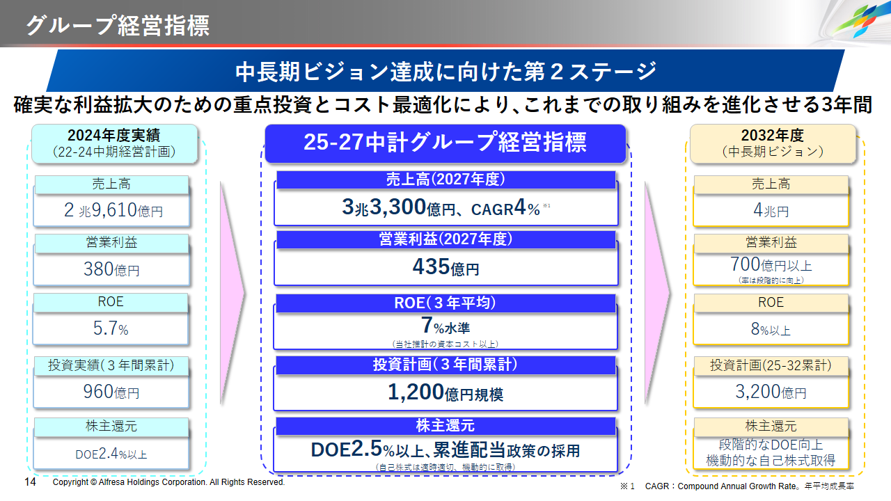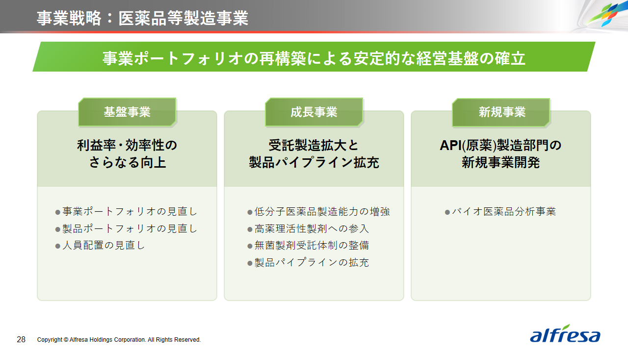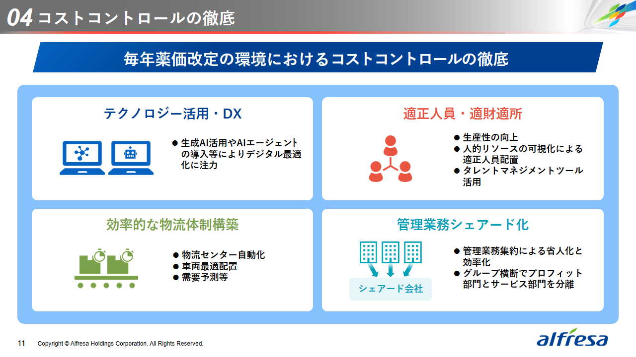 当社グループは、2023年に策定した2032年度までの中長期的な事業戦略および財務・資本戦略「アルフレッサグループ中長期ビジョン」において、グループ理念に基づき、健康寿命の延伸、地域医療への貢献、およびヘルスケア・イノベーションなどの社会価値を創造するため、基盤事業強化、成長事業育成、新規事業開発の事業戦略を遂行し、トータルサプライチェーンサービスの強化と拡大を目指しています。今回策定した「25‐27中計」は、「中長期ビジョン」の目標達成に向けた第2ステージであり、確実な利益拡大のための重点投資とコスト最適化により、これまでの取り組みを進化させてまいります。