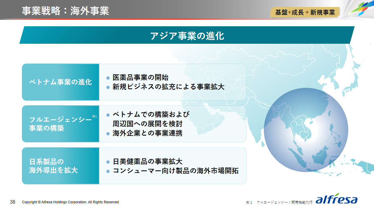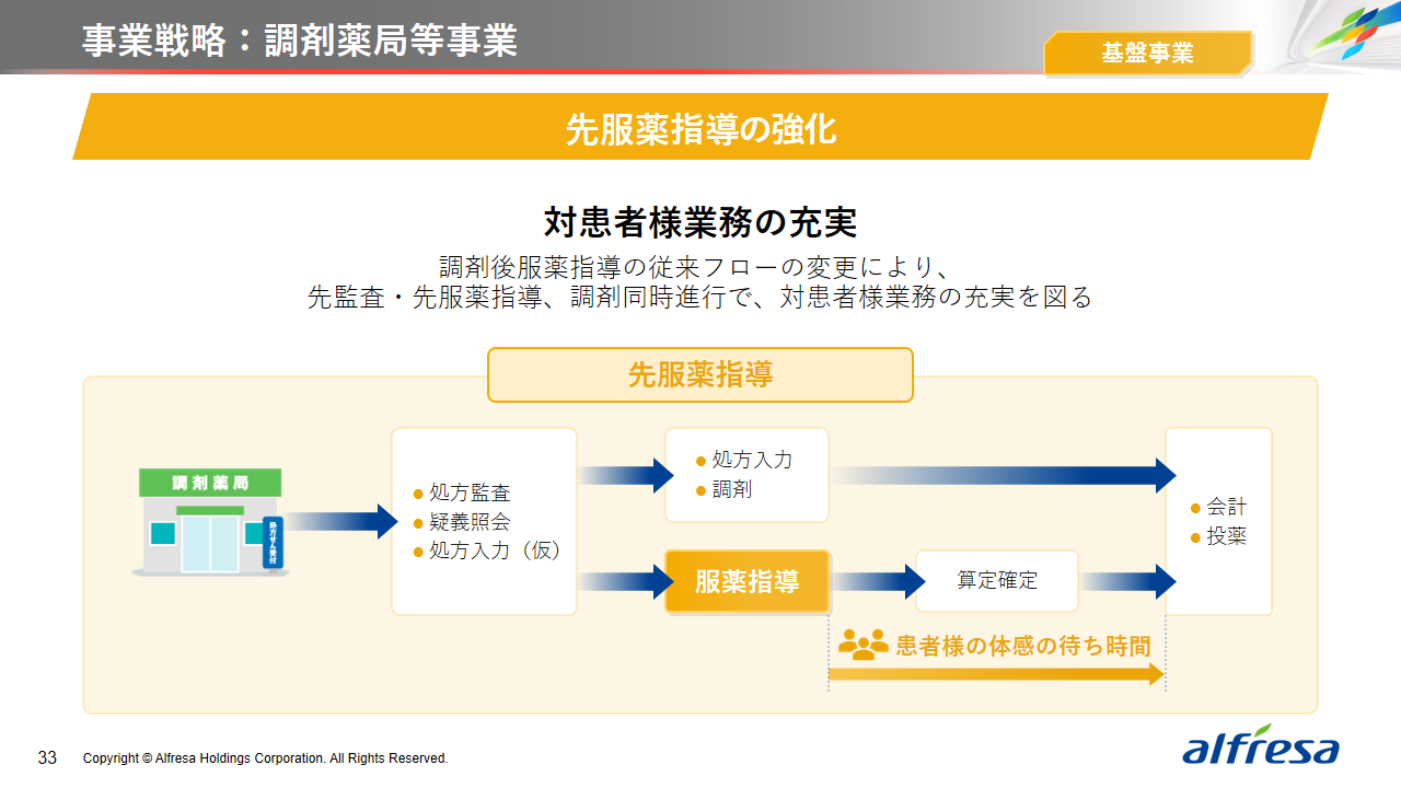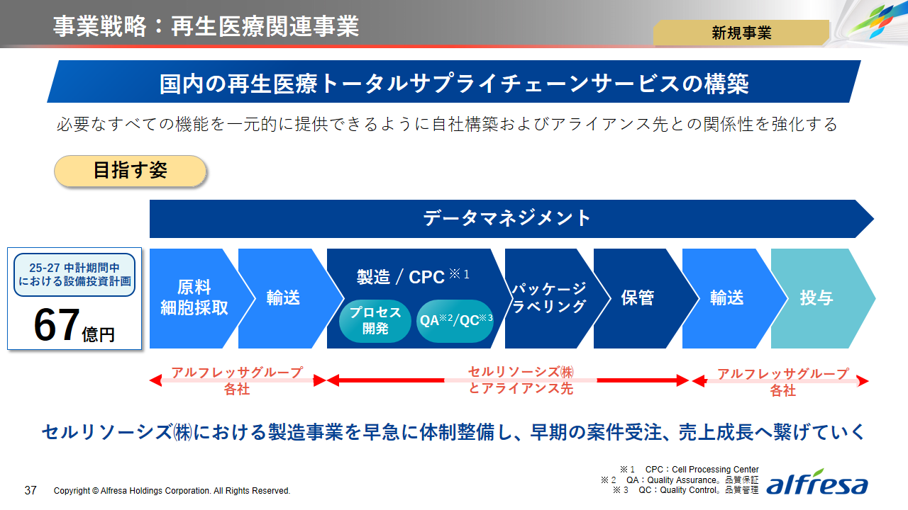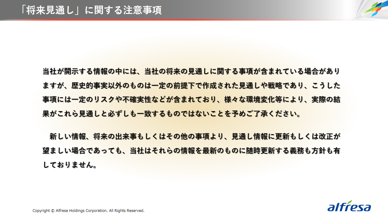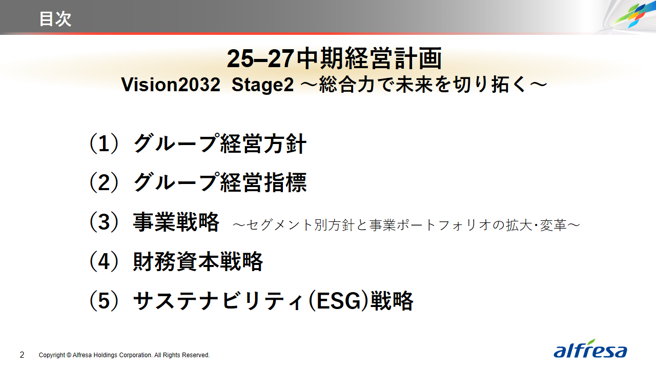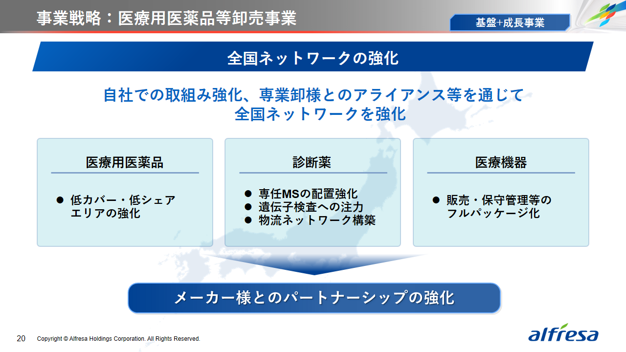 当社グループは、2023年に策定した2032年度までの中長期的な事業戦略および財務・資本戦略「アルフレッサグループ中長期ビジョン」において、グループ理念に基づき、健康寿命の延伸、地域医療への貢献、およびヘルスケア・イノベーションなどの社会価値を創造するため、基盤事業強化、成長事業育成、新規事業開発の事業戦略を遂行し、トータルサプライチェーンサービスの強化と拡大を目指しています。今回策定した「25‐27中計」は、「中長期ビジョン」の目標達成に向けた第2ステージであり、確実な利益拡大のための重点投資とコスト最適化により、これまでの取り組みを進化させてまいります。