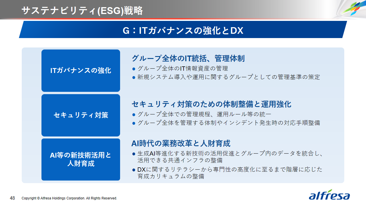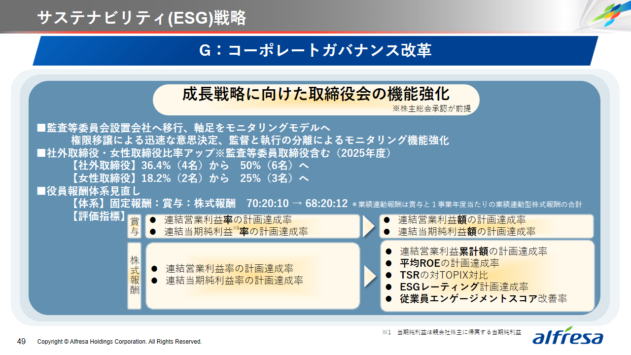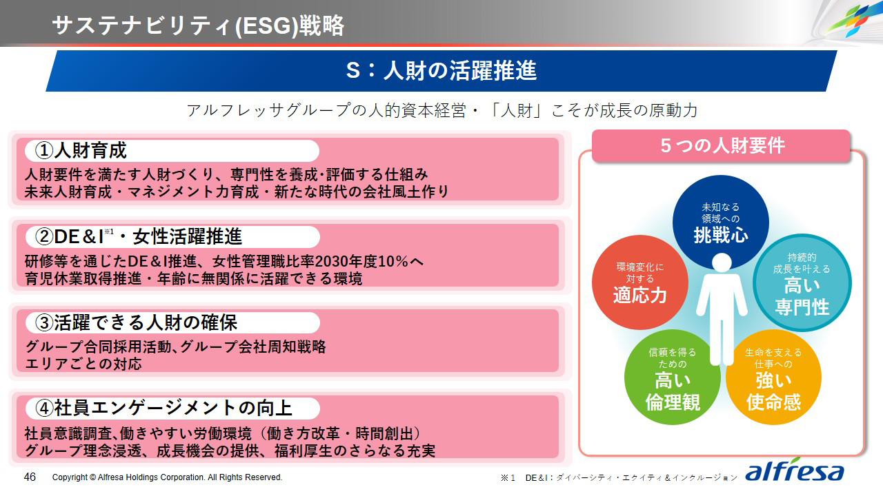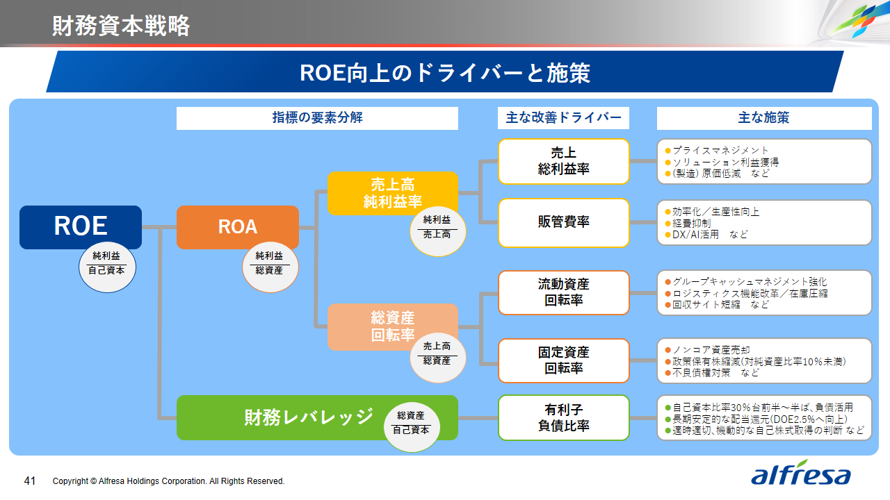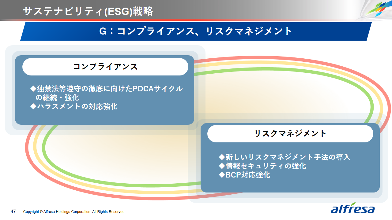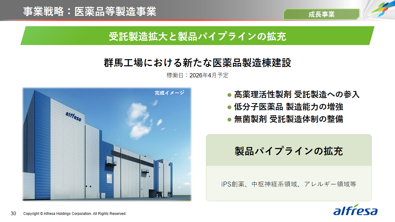 当社グループは、2023年に策定した2032年度までの中長期的な事業戦略および財務・資本戦略「アルフレッサグループ中長期ビジョン」において、グループ理念に基づき、健康寿命の延伸、地域医療への貢献、およびヘルスケア・イノベーションなどの社会価値を創造するため、基盤事業強化、成長事業育成、新規事業開発の事業戦略を遂行し、トータルサプライチェーンサービスの強化と拡大を目指しています。今回策定した「25‐27中計」は、「中長期ビジョン」の目標達成に向けた第2ステージであり、確実な利益拡大のための重点投資とコスト最適化により、これまでの取り組みを進化させてまいります。