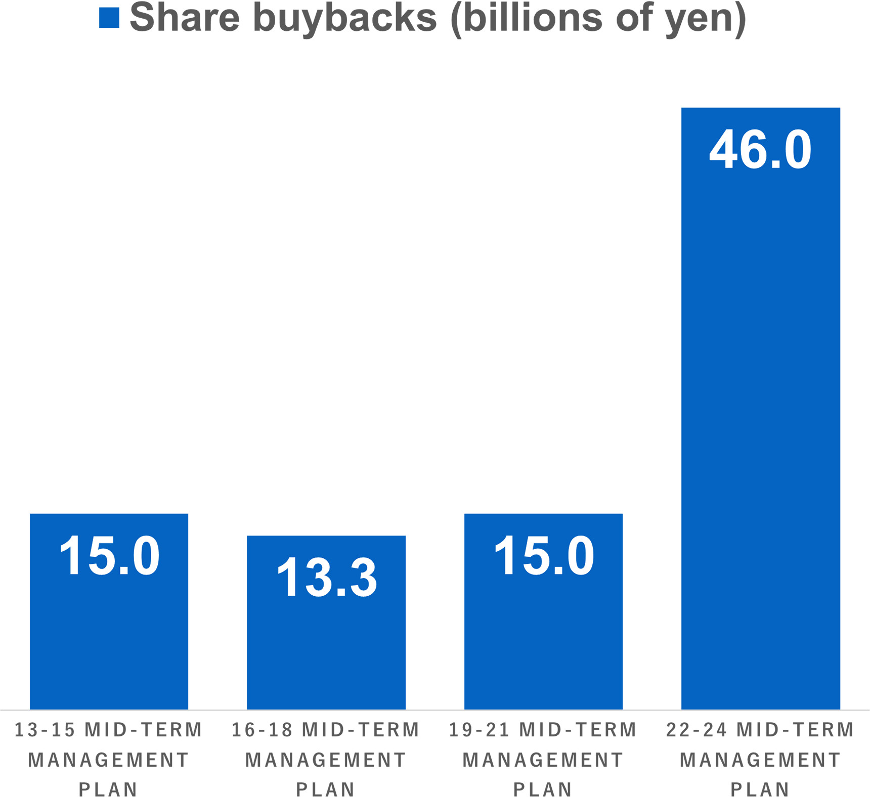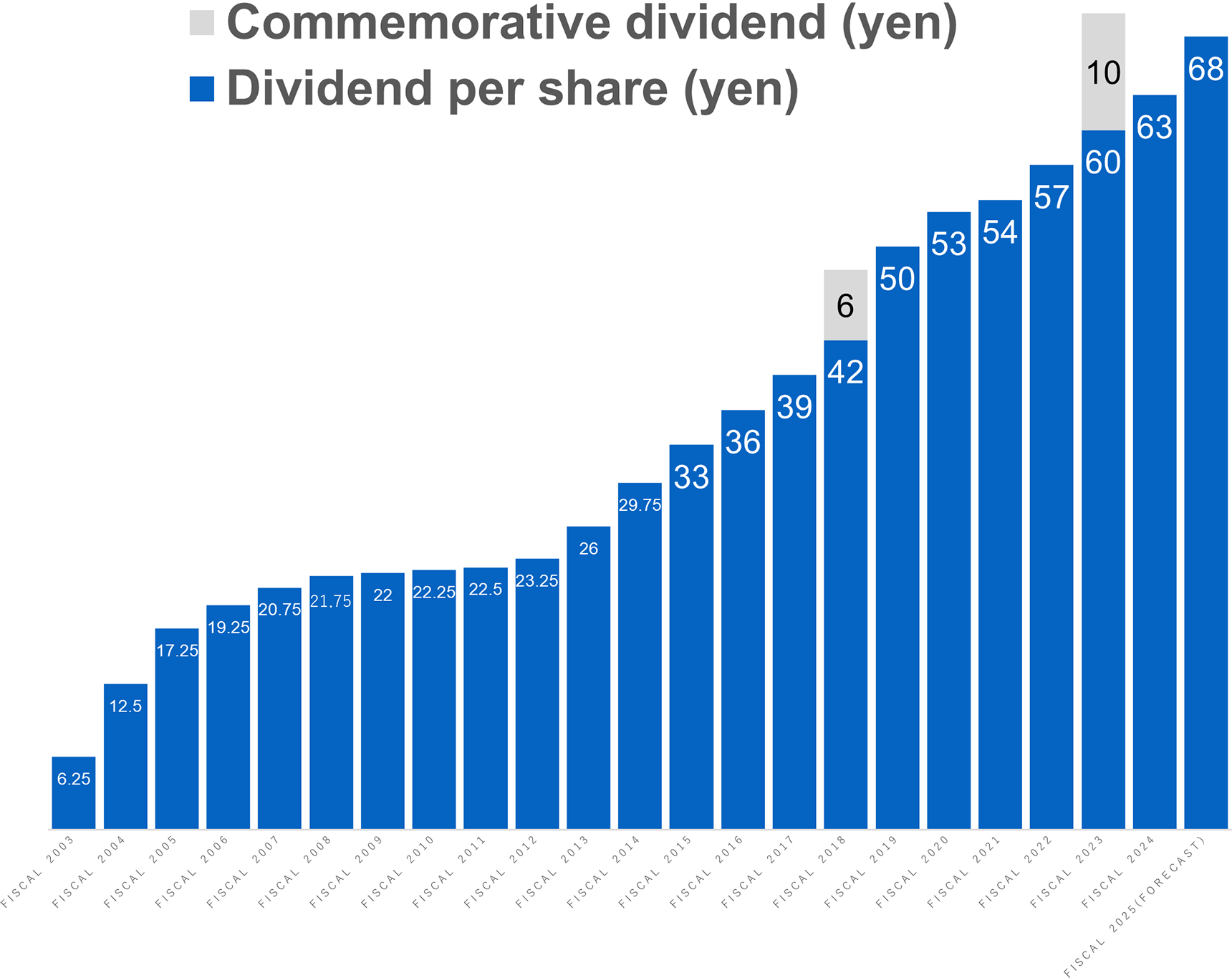 The Company has positioned the distribution of profits to shareholders as a key management policy. Accordingly, it has set the progressive dividend policy of the dividend on equity (DOE) at 2.5% or higher for the period of the 25-27 Medium-term Management Plan. DOE will be determined based on the Company’s consolidated financial results with comprehensive consideration for strengthening of the financial standing, stabilization of the management base, and development of future business.