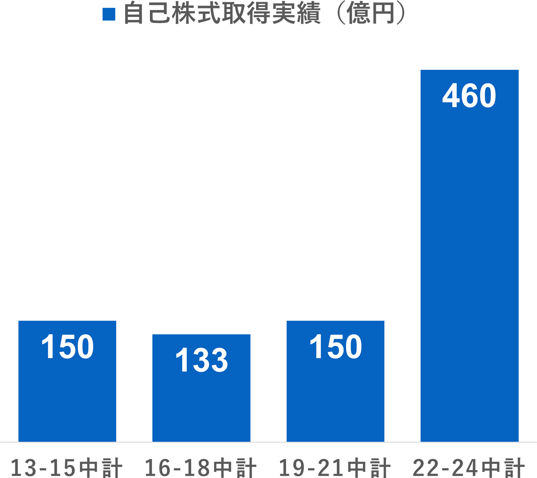 当社は、株主の皆様に対する利益の還元を重要政策のひとつと考えております。配当方針は、25-27中期経営計画より純資産配当率(DOE)2.5%以上かつ累進配当としております。連結業績を基準に、財務体質の強化や経営基盤の安定性、および将来の事業展開等を総合的に考慮し、決定してまいります。