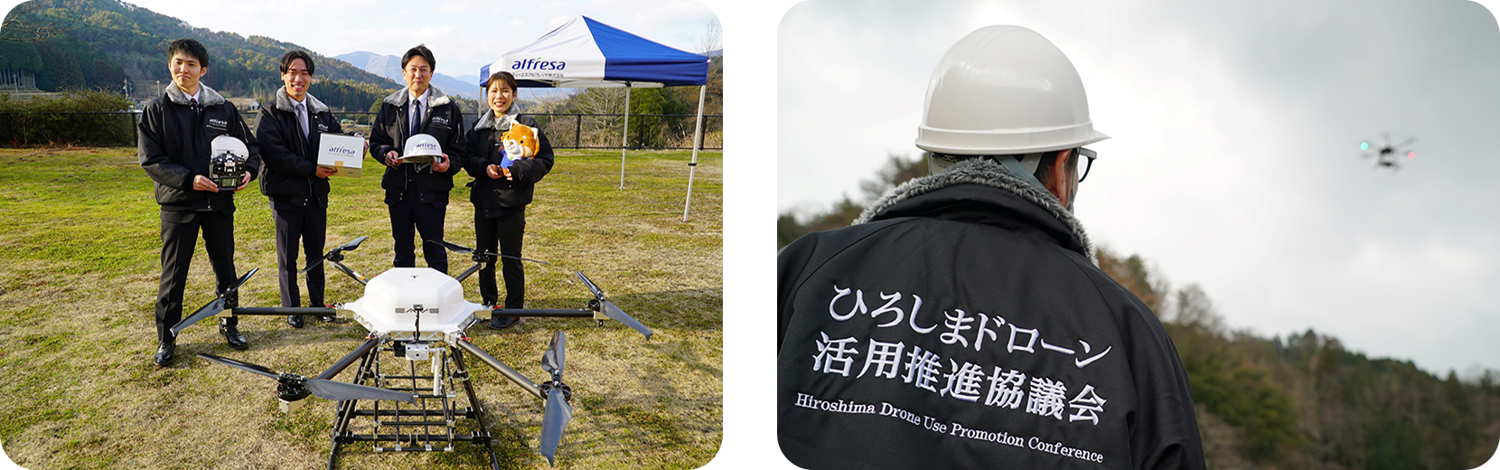 日本全国が事業エリアであるアルフレッサグループにとって、地域固有の地形が、すべての人々に健康と安心を届けたいという思いを阻む場合もあります。中山間地域と離島が多い山陽エリアを営業地にもつティーエスアルフレッサ(株)にとっても、これは大きな課題でした。そこで着目したのが、ドローンによる医薬品配送です。日本ドローン機構(株)と連携して「ひろしまドローン活用推進協議会」を設立し、広島県廿日市市をオブザーバーに、現在ドローン配送の実証実験が進んでいます。